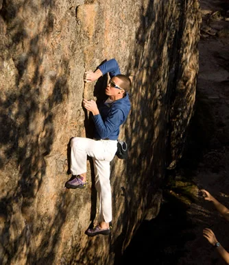 Using climbing shoes, gymnasts chalk, and a mattress-like bouldering mat, bouldering allows a climber to focus solely on the freedom of movement.